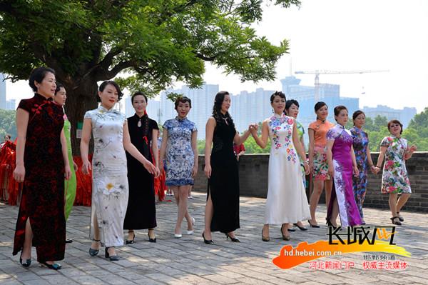 在古老的丛台公园,旗袍爱好者们纷纷身着各式旗袍,从传统版到现代改良版的旗袍色彩缤纷,花纹、颜色各异,衬托出穿着者端庄娇美、华丽而不张扬。在绿水环绕、青翠绿植的映衬下,以千年历史的赵王点将台为舞台,进行了翩跹轻舞的旗袍秀风采展示。